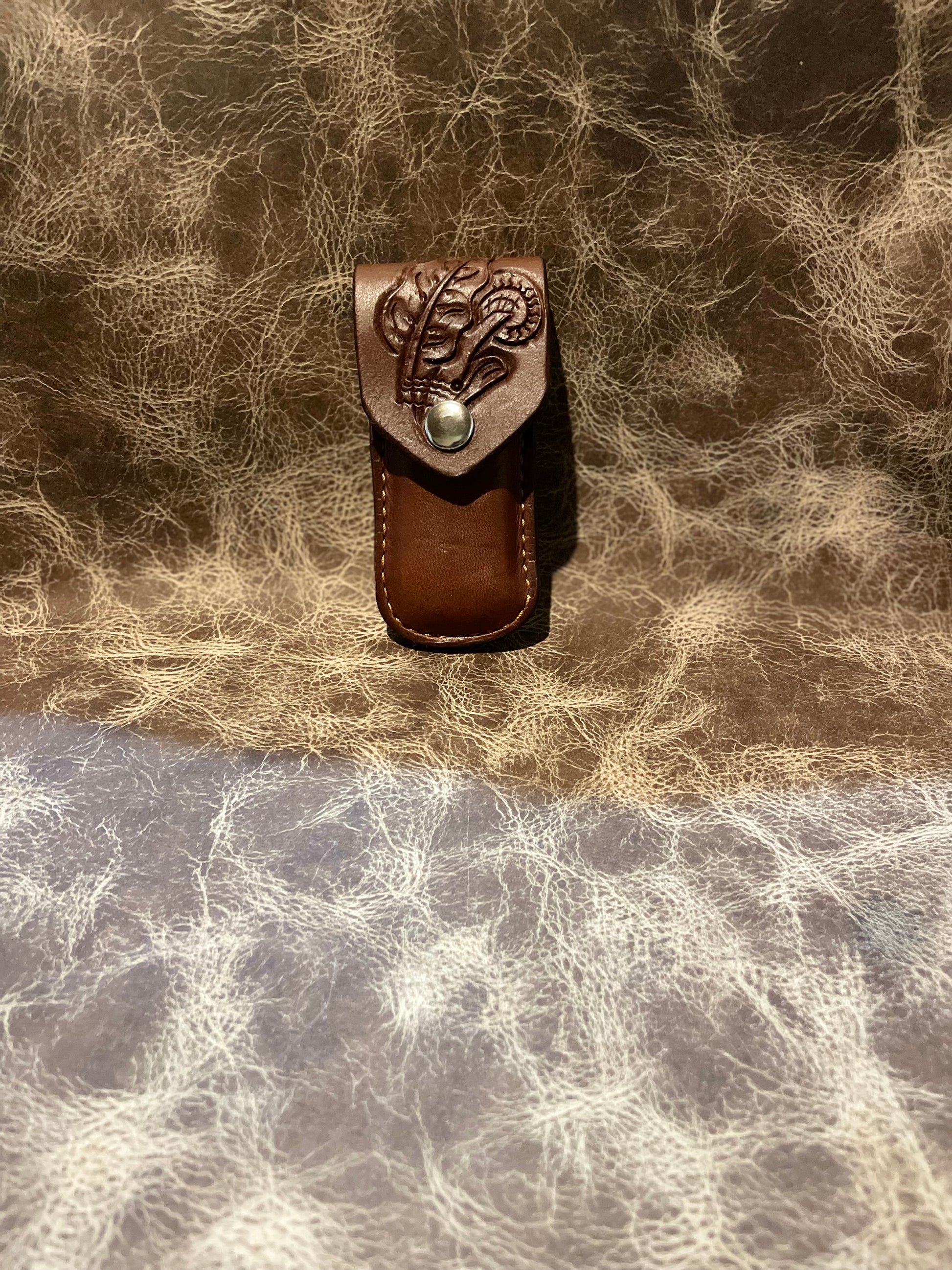 Hermann Oak Leather, Hand Carved, snap to close